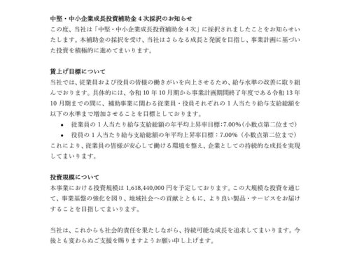 中堅・中小企業成長投資補助金4次採択のお知らせ【賃金引き上げ計画の表明確認書】